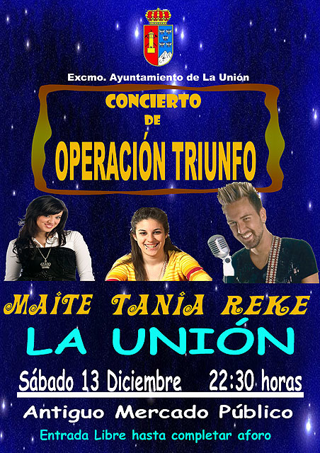 Los ex concursantes del programa de televisión Operación Triunfo, Maite, Reke y Tania, estos dos últimos participantes de la última edición emitida, ofrecerán un concierto en La Unión el próximo sábado 13 de diciembre.