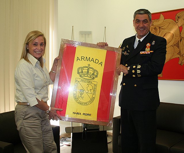 La consejera de Presidencia y Administraciones Públicas, María Pedro Reverte, recibió hoy, de manos del director de la Escuela de Infantería de Marina ‘General Albacete y Fuster' de Cartagena, el coronel Carlos Julio Rey Vich, la bandera mochila por su jura ante la bandera de España que realizó en el Polideportivo Municipal de La Unión el pasado mes de enero.