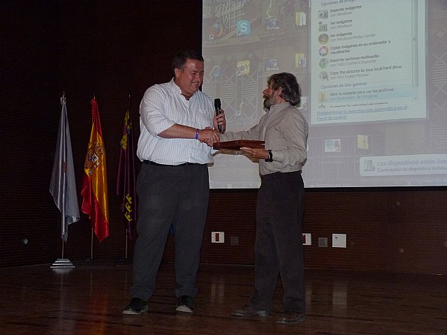 El momento más esperado llegó con la ponencia de César Pérez de Tudela, auténtico mito del alpinismo español, quien realizó una completa exposición sobre sus múltiples expediciones. El Alcalde de La Unión, Francisco Bernabé, entregó al alpinista madrileño una placa conmemorativa realizada por los alumnos de la Fundación Andrés Martínez Cánovas como recuerdo de su paso por La Unión.