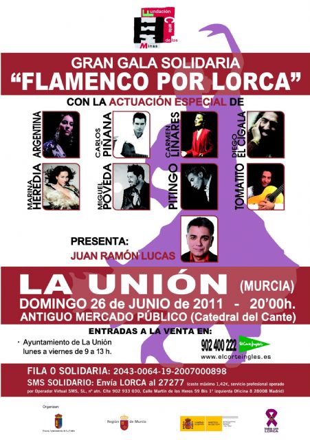 El próximo domingo 26 de junio, a partir de las 20.00 horas, el Antiguo Mercado Público acogerá la Gran Gala Solidaria "Flamenco por Lorca", que ha sido organizada por el Ayuntamiento de La Unión y la Fundación Cante de las Minas para ayudar a los damnificado por los terremotos acaecidos en la Ciudad del Sol el pasado 11 de mayo.