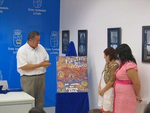 La pintora unionense Toñi Martínez Meroño ha presentado esta mañana, en compañía de nuestro alcalde, Francisco Bernabé, y de nuestra Concejal de Festejos, María Hermógenes, el cuadro que ha realizado y que va a servir de cartel para las próximas Fiestas en Honor a la Virgen del Rosario.
