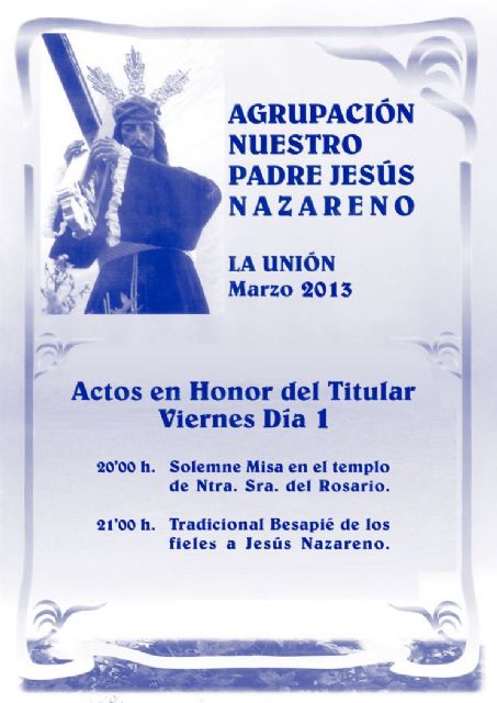 Este próximo viernes, día 1 de marzo, a las 20.00 horas, la Iglesia de Nuestra Señora del Rosario acogerá la Santa Misa y el Besapié a la talla del titular de la Agrupación.