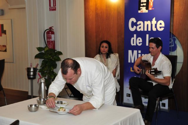 Y como aperitivo, los asistentes pudieron disfrutar de la actuación de la cantaora alicantina Raquel Álvarez y el toque de Francisco Tornero, que han interpretado una minera de Encarnación Fernández para acompañar tan suculento manjar. Para ellos la experiencia resulta igualmente fructífera pues "sirve de inspiración tanto a uno como a otro, se trata de una retroalimentación, donde nos damos glamour uno a otro". Los artistas flamencos se han mostrado emocionados con esta fusión "novedosa y original" y han interpretado un recital compuesto por una granaína, en homenaje también a la cantaora unionense Encarnación Fernández, levantica, tientos, alegrías, tangos y bulería por soleá.