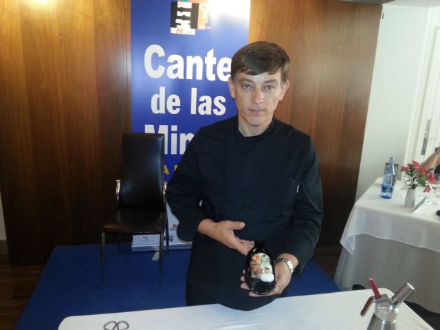 De esta forma, el servicio del sábado noche correspondió al profesor del Centro de Cualificación Turística de Murcia y asesor gastronómico de varios restaurantes, David López Carreño, quien hizo una demostración de sus platos en directo ante los cerca de 60 comensales que llenaron el comedor del restaurante unionense, estos son, el plato principal consistente en el canelón de cebolla y pollo de corral con cremoso de romero y el postre, manzana de feria con tierra de cacao y helado de regaliz. En la búsqueda de inspiración de estos platos, el cocinero natural de Hellín, visitó la mina Agrupa Vicenta y allí pudo conocer la forma de vida de los mineros "me sorprendió la tierra pero también la humildad y la pobreza de los mineros de la época, por eso aprovecho todo el pollo, el animal que criaban estas gentes y daba sustento a la penuria de los mineros". Concretamente para este canelón de carne, utiliza la cresta del pollo gelificado junto con cebolla en lugar de la pasta de trigo y lo rellene con una farsa a base de pollo junto con una mezcla de setas, y ello decorado con un crujiente elaborado con la piel del pollo y la espuma de romero, tan natural de la tierra, "se trata de una descomposición del pollo de corral", concluye David López. Y acerca de la experiencia asegura que "me gustaría repetirlo, incluso se podría hacer en otro país".