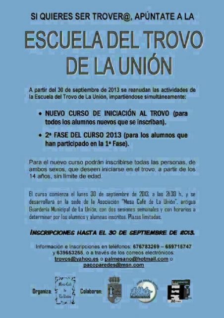 La Escuela del Trovo de La Unión, entidad tutelada por la Asociación Literaria Mesa-Café y que cuenta con la colaboración de la Fundación Cante de las Minas y del Ayuntamiento de nuestra ciudad, va a dar inicio a una nueva edición de sus clases de formación, en lo que va a ser su tercera promoción.