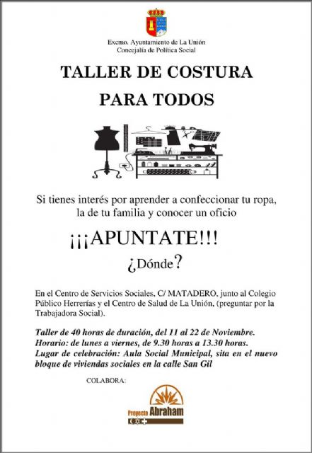 El Ayuntamiento de La Unión en colaboración con la Asociación Proyecto Abraham, va a realizar un Taller de Costura, de carácter gratuito, dirigido a todas aquellas personas que tengan interés por aprender a confeccionar e incluso conocer un nuevo oficio.
