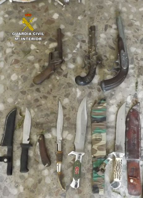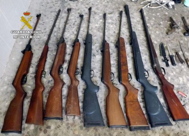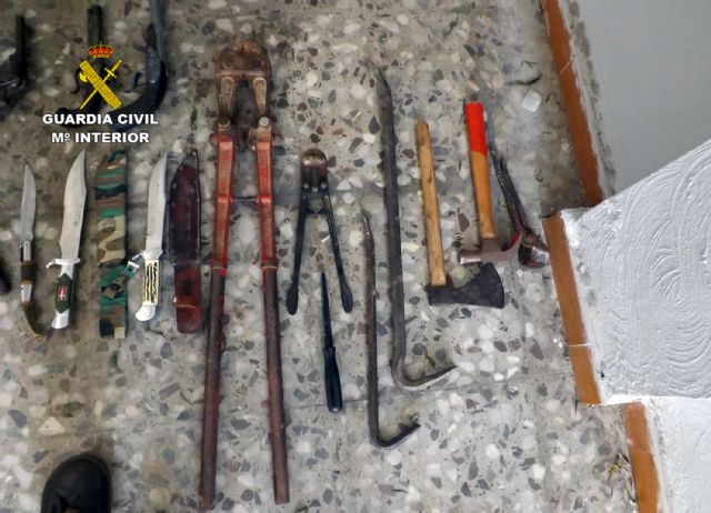 En el registro domiciliario efectuado en La Unión, sede de la banda, se han incautado dos escopetas, siete carabinas, un revólver, dos pistolas simuladas, machetes y navajas, efectos sustraídos, como teléfonos móviles y joyas, y herramientas, tanto sustraídas como utilizadas en su actividad delictiva.