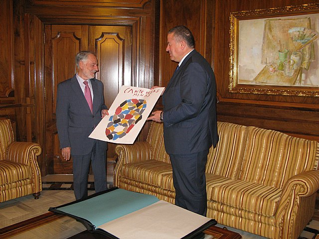 El presidente de la Asamblea Regional de Murcia, Francisco Celdrán Vidal, ha recibido hoy de manos del alcalde de La Unión, Francisco Bernabé, una serigrafía del cartel anunciador de la última edición del Festival Internacional del Cante de las Minas, obra de Eduardo Arroyo, como muestra de gratitud por el apoyo explícito de la Asamblea Regional a este certamen.