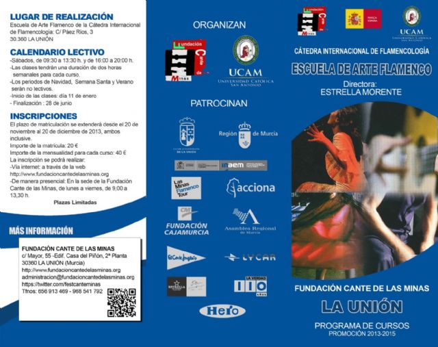 La primera de ellas se ha anunciado ya esta misma mañana, al quedar abierto el plazo de matrícula en los cursos de cante, baile, guitarra y percusión de la Escuela de Arte Flamenco a partir de mañana día 20 de noviembre. El mismo se cerrará el próximo 20 de diciembre. Los alumnos inscritos comenzarán las clases el próximo mes de enero tras las vacaciones de Navidad.