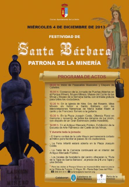 El próximo miércoles día 4 de diciembre, Festividad de Santa Bárbara, Patrona de la Minería, La Unión va a vivir uno de sus días grandes a nivel local pues se va a volver a reeditar, como en años anteriores, la fiesta histórica de los mineros por excelencia.