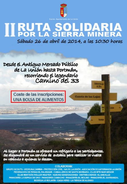 Mañana sábado tendrá lugar la II Ruta Solidaria por la Sierra que partirá a las 10:30 horas desde el Antiguo Mercado Público con destino a Portmán por el Camino del 33. Se solicita de los participantes que aporten una bolsa de alimentos no perecederos para destinarlos a fines sociales. Al llegar a Portmán se servirá un refrigerio a los asistentes, tras lo que se dispondrá de un servicio de autobús para la vuelta a La Unión de quienes así lo deseen.