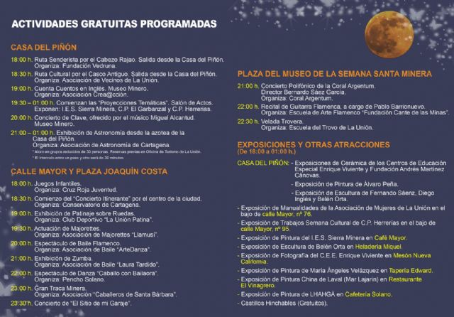 El programa contempla la entrada libre al Museo Minero, al Museo del Cante de las Minas y al Museo de la Semana Santa Minera, así como la realización de más de treinta actividades lúdicas, todas de carácter gratuito, entre las que no faltaran la música, el baile, el trovo, el deporte, la astronomía, barrenazos mineros, hinchables para los niños, y numerosas exposiciones de pintura, escultura y fotografía.