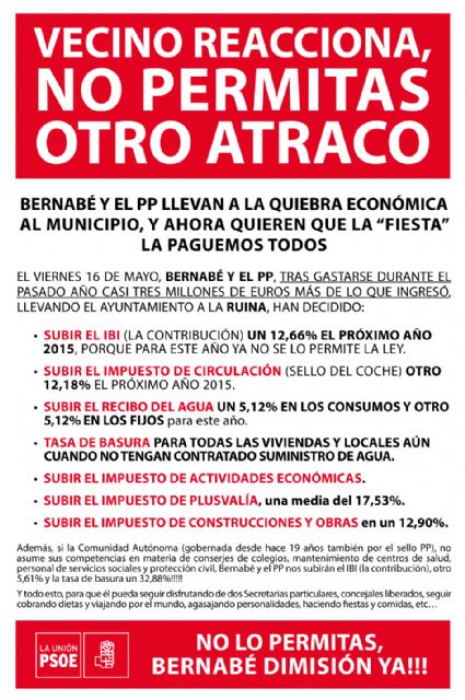 Desde el PSOE de La Unión comentan que "la nefasta gestión económica de Bernabé y el PP están llevando al municipio a la ruina, y la falta de rumbo del gobierno municipal resulta alarmante, hasta el punto de aprobar un Plan de Ajuste que afectará de forma importantísima a los bolsillos de los unionenses, pues contempla la subida del IBI o contribución en un 12,66 %, del Impuesto de Circulación o sello del coche en otro 12,18%, las Plusvalías una media del 17,53%, las licencias de obras en un 12,90%, la tasa de suministro de agua potable en un 5,12% en los consumos y otro 5,12% en los fijos, etc…., todo con el objetivo de conseguir una mayor recaudación de 1.039.000 euros que pagaremos entre todos los unionenses, y de los cuales 577.818 €, casi 100 millones de las antiguas pesetas vendrán en incremento de la contribución o IBI¨.