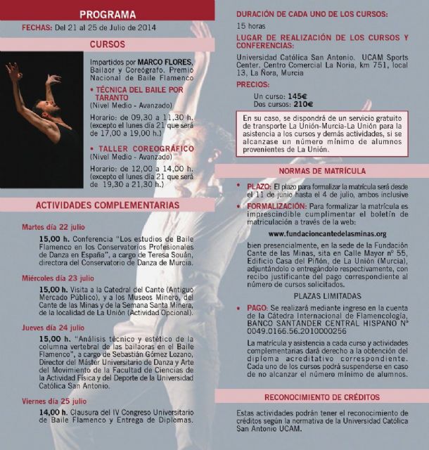El curso ha sido presentado por el Presidente de la Universidad Católica de Murcia, José Luis Mendoza, por el Director General de Universidades de la Región de Murcia, Luis Javier Lozano, y por el Alcalde de La Unión y Presidente Ejecutivo de la Fundación Cante de las Minas, Francisco Bernabé, como representantes de las entidades organizadoras de esta actividad, que se desarrolla asimismo en colaboración con el Conservatorio de Danza de Murcia.