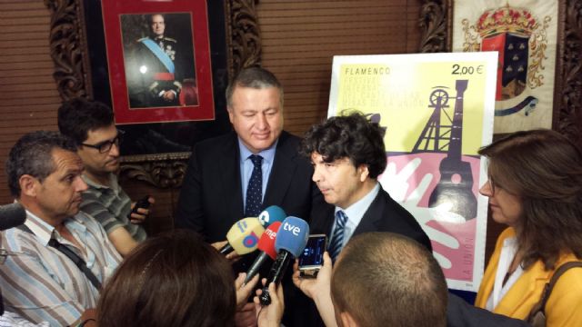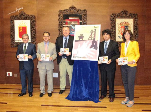El Subsecretario de Fomento, Mario Garcés Sanagustín, junto al Alcalde de La Unión y Presidente Ejecutivo de la Fundación Cante de las Minas, Francisco Bernabé y el Presidente de CORREOS, Javier Cuesta Nuin, ha presentado hoy el sello que CORREOS ha dedicado a "El flamenco. Festival Internacional del Cante de las Minas de La Unión". El acto se ha celebrado a las 10 horas en el Ayuntamiento de La Unión y en el mismo también han estado presentes el Delegado del Gobierno, Joaquín Bascuñana García y la Directora General de Industrias Culturales, Marta López-Briones.