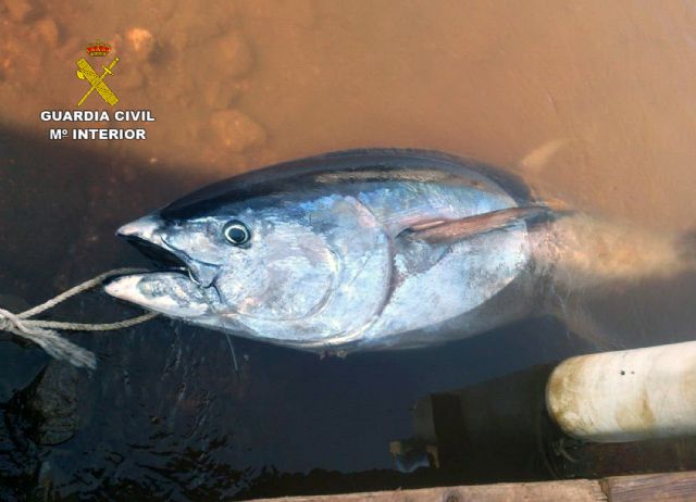 La Guardia Civil de la Región de Murcia, en uno de los servicios enmarcados en el 'Plan contra las capturas ilegales de atún rojo', ha sorprendido en el puerto deportivo de Portman-Cartagena a dos pescadores con un espécimen de esta especie de 158 kilos, capturado ilícitamente al encontrase en época de veda.