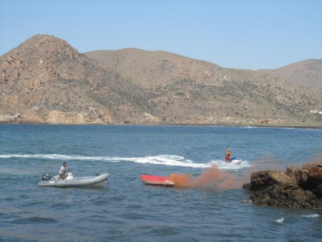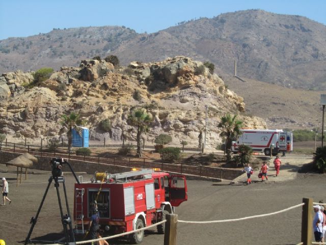 Los efectivos del Plan COPLA, Protección Civil y Cruz Roja de La Unión han realizado esta mañana en la playa de El Lastre, en Portmán, un ejercicio conjunto de salvamento marítimo en el que se ha simulado el rescate de los tripulantes de una embarcación en llamas, el auxilio y reanimación de los mismos y la extinción del incendio.