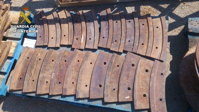 En tres empresas del sector metálico, la Guardia Civil ha recuperado más de un millar de piezas metálicas de la maquinaria de la Sierra Minera, como placas, tapas y discos espesadores, piezas de molino, sinfines, embones y ejes de bomba entre otros, que arrojan un peso de 9.000 Kg.