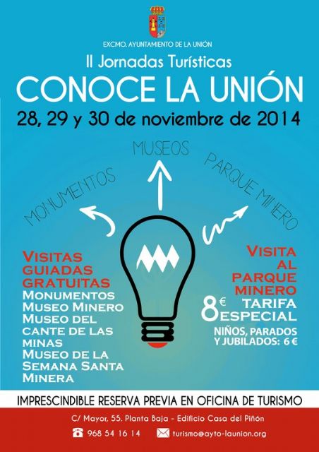 La Concejalía de Turismo que dirige Laura Vicente ha puesto en marcha, de cara al fin de semana del 28, 29 y 30 de noviembre próximos, las II Jornadas de Turismo "Conoce La Unión", destinadas a dar a conocer, de forma gratuita y a todo aquel que esté interesado, las bondades y atractivos de nuestro municipio.