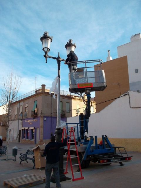 La empresa Elsamex ha procedido, con la supervisión de la Concejalía de Infraestructuras que dirige Salvador Martínez, a sustituir las farolas en la Plaza Joaquín Costa y su entorno, en cumplimiento del pliego de condiciones por el que la empresa resultó adjudicataria del concurso del alumbrado público.