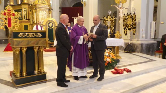 El pregonero fue posteriormente homenajeado por nuestro Alcalde, Julio García, y por el Hermano Mayor de la Cofradía del Stmo. Cristo de los Mineros, Juan Antonio Pérez, quienes le hicieron entrega de una placa de gratitud y de la insignia de la Cofradía.