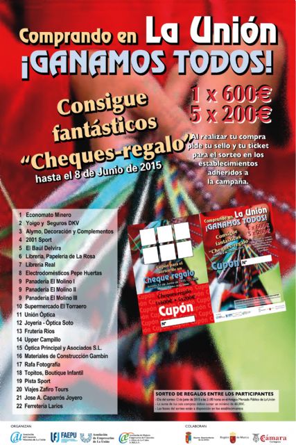 Los comerciantes de La Unión van a desarrollar un año más, en colaboración con el Ayuntamiento de La Unión, la Campaña Comercial de los Cheques Regalo para premiar las compras realizadas en sus establecimientos.