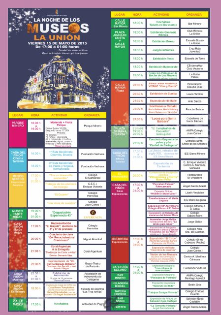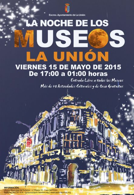 El Ayuntamiento de La Unión, a través de la Concejalía de Turismo que dirige Laura Vicente, ha organizado el programa de la Noche de los Museos, que tendrá lugar en nuestra ciudad el próximo viernes día 15 de mayo, de las 17:00h. de la tarde a la 1:00h. de la madrugada.