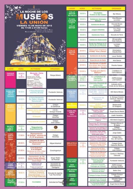 El Ayuntamiento de La Unión, a través de la Concejalía de Turismo que dirige Laura Vicente, ha organizado el programa de la Noche de los Museos, que tendrá lugar en nuestra ciudad mañana, de las 17:00h. de la tarde a la 1:00h. de la madrugada.