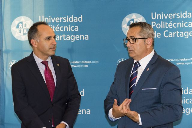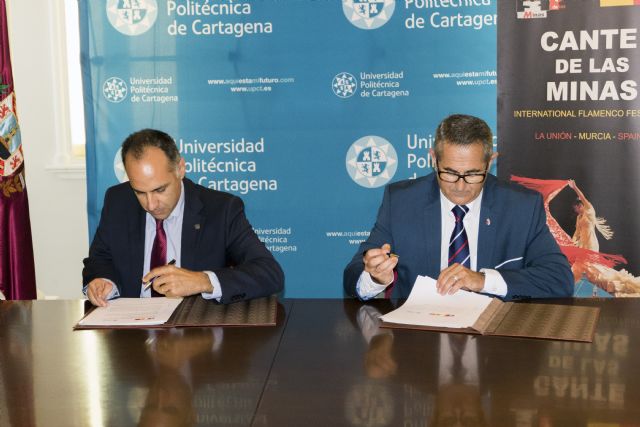 Esta mañana se ha materializado el acuerdo de colaboración entre la Universidad Politécnica de Cartagena -UPCT- y el Festival Internacional del Cante de las Minas en materia de Innovación y desarrollo tecnológico. La firma de dicho convenio se ha llevado a cabo en la sede del Rectorado por parte de D. Alejandro Díaz Morcillo -Rector de la UPCT - y D. Pedro López Milán -Alcalde de La Unión y Presidente Ejecutivo de la Fundación Cante de las Minas-. El acto ha contado también con la presencia de D. Juan Luis Pedreño Molina -Coordinador del Centro de Producción de Contenidos Digitales de la UPCT- y D. Ricardo Mármol -Concejal de Urbanismo y Nuevas Tecnologías del Ayuntamiento de La Unión-.