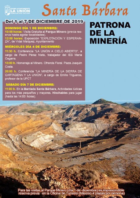 La Festividad de Santa Bárbara, Patrona de la Minería, que celebraremos el próximo día 4 de Diciembre, viene con un programa de actividades que desde la Concejalía de Cultura, se ha realizado para dar a conocer mejor la historia de nuestro Municipio, en especial a los más jóvenes.