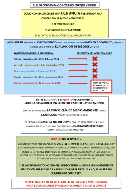 Ahora tras la quinta notificación enviada al ayuntamiento sin contestación alguna, el alcalde habla de deslealtad por parte de la consejería de Medio Ambiente sobre las actuaciones en los suelos contaminados en el Colegio, pero no habla en ningún momento de los 5 requerimientos enviados al ayuntamiento y que no ha contestado a ninguno.