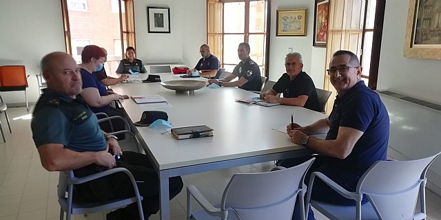 El Alcalde de La Unión, Pedro López Milán, la Concejal de Hacienda, Elena José Lozano Bleda y el Concejal de Seguridad, José Solano Legaz, se reunían esta mañana en el Ayuntamiento, con los responsables de Policía Local, Guardia Civil y Protección Civil en nuestro Municipio para coordinar el cumplimiento de las medidas de higiene, aforo y prevención de contagios que ya han comenzado a regir en la Región de Murcia desde este lunes, al finalizar el Estado de Alarma decretado por el Gobierno de la Nación.