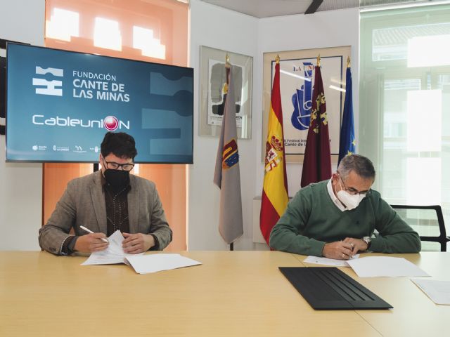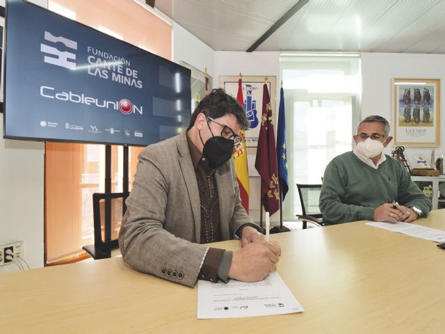 Esta mañana se ha firmado el convenido de colaboración entre la Fundación Cante de las Minas y la empresa Cableunión Media, en un acto que ha contado con la presencia del Presidente de la Fundación y alcalde de La Unión, Pedro López Milán, y el gerente de la empresa local de telecomunicaciones, Francisco Javier Pagán.
