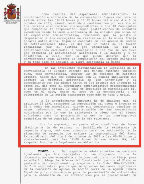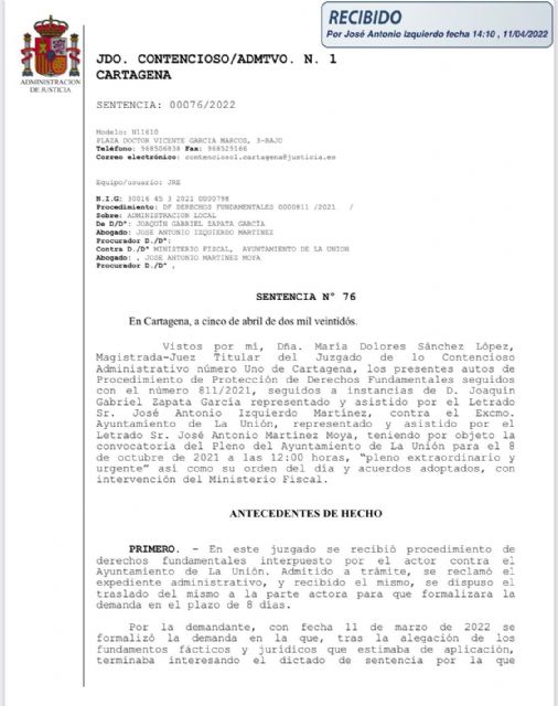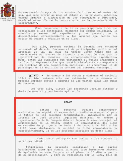 Esa convocatoria fue recurrida ante la justicia por el PP, pues entendíamos que vulneraba nuestro derecho a la participación política en defensa de los ciudadanos de La Unión, al privarnos de poder preparar el pleno con un mínimo de antelación.