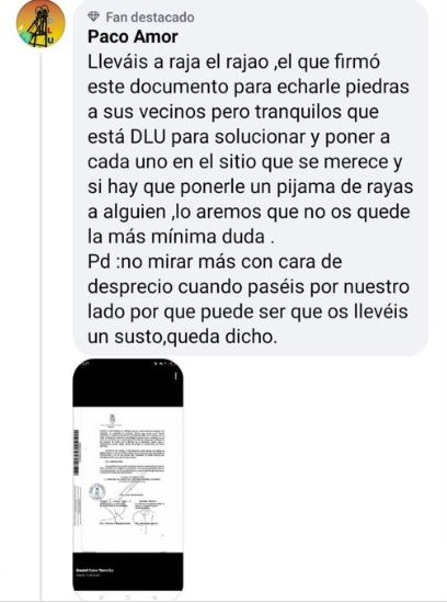 García ha dado a conocer que "la violencia verbal que estamos sufriendo por parte de este partido ha tenido como último episodio intolerable la amenaza que ha realizado el número 7 de esta candidatura, Francisco Jesús García Amor, a MC La Unión, quien nos avisó que cuando pasemos por su lado puede ser que os llevéis un susto, queda dicho".