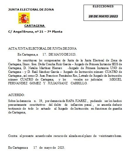 La candidata a la Alcaldía por MC La Unión ha dado a conocer que "al objeto de frenar esta escalada de violencia verbal, hemos denunciado las amenazas a la Junta Electoral de Zona, quien ha dado traslado al Juzgado de Instrucción de Guardia de Cartagena".