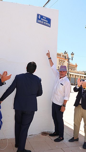 Una nueva placa brilla a los pies de la 'Catedral del Cante': la que pone el nombre de Carlos Herrera a una de sus calles más próximas. Tras la entrega de la 'Llave de la ciudad', los asistentes se desplazaron hasta allí para descubrir este nuevo indicativo. "Es un justo reconocimiento a una figura de esta relevancia profesional y mediática, que siempre que puede habla bien de la Región de Murcia y es un gran embajador", destacó tras la inauguración el presidente de la Comunidad Autónoma de la Región de Murcia, Fernando López Miras, añadiendo que "lo sentimos como un ciudadano más de la Región".