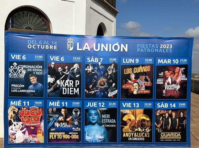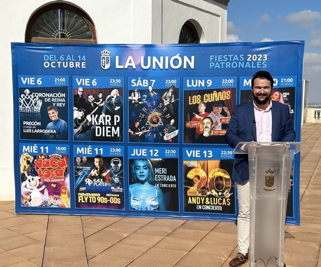 El alcalde de La Unión ha presentado hoy la programación de las Fiestas Patronales de 2023 que tendrán lugar del 6 al 14 de octubre, con una numerosa agenda de actividades lúdicas y religiosas y un total de 23 peñas que celebrarán actividades a diario en sus respectivas sedes, centradas en la Plaza Joaquín Costa. El alcalde ha resaltado que "serán nueve días de fiesta en las que volverán a resurgir las actividades de antaño, como los grandes conciertos y la paella y la tortilla gigantes, que tanto hacen disfrutar a nuestro vecinos".