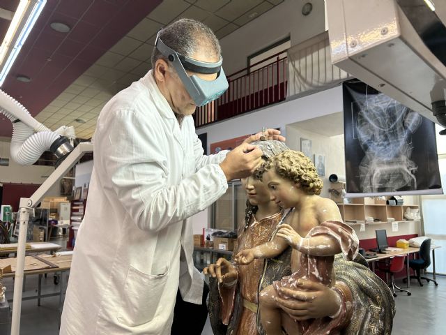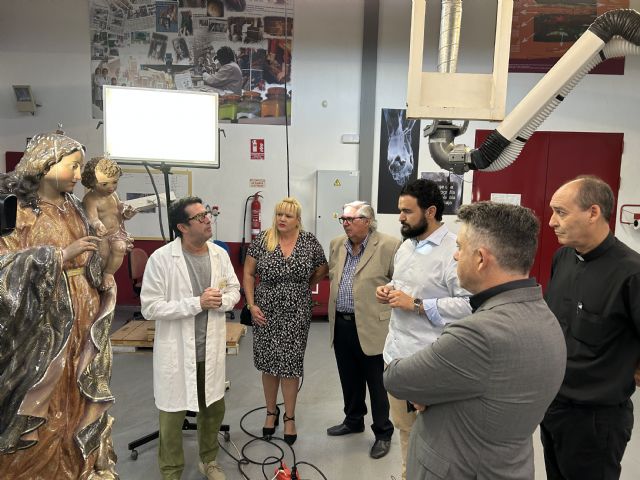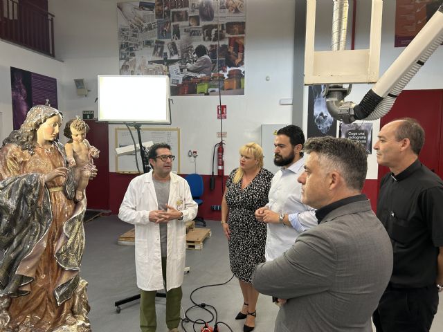 El alcalde de La Unión ha visitado esta mañana el Centro de Restauración de la Comunidad Autónoma de la Región de Murcia (CRRM) para supervisar los trabajos que se están llevando a cabo en la imagen de la Patrona del municipio, la Virgen del Rosario, y que ya han entrado en su etapa final.
