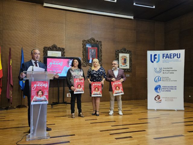 La concejal de Hacienda y Economía, Tere López, la concejal de Comercio, Laura Giménez, el presidente de FAEPU, Carlos Bernabé, el director general de Impulso al Comercio, Rafa Gómez y el presidente de la Asociación de Comercios de La Unión, Estani Martínez, han presentado hoy la campaña 'Compra con ganas' que tendrá lugar hasta el 30 de noviembre en los comercios de la ciudad. La campaña está organizada por FAEPU, con la colaboración del Ayuntamiento y la Comunidad Autónoma.