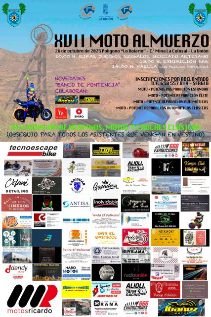 La Unión volverá a rugir con el motor el próximo domingo 26 de octubre de 2025, con la celebración del XVII Moto Almuerzo, organizado por el Moto Club La Unión, en colaboración con el Ayuntamiento de La Unión.