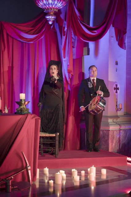 El olor a incienso, el humo suspendido en el aire, la iluminación tenue, las telas rojas colgando del altar y la sobriedad de la silla de anea, de la que cuelga una fina mantilla, junto a las velas que rodean todo el espacio, componían una escenografía de enorme delicadeza. La mantilla, los silencios y el recogimiento del público terminaron de construir un ambiente íntimo y solemne, donde cada cante adquiría una dimensión casi espiritual.